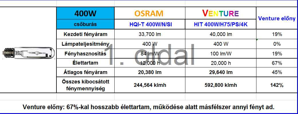 A 400W-os csőburás lámpák közül az egyik leggyakrabban használt típust, az OSRAM HQI-T 400W N/SI-t hasonlítottuk össze a Venture HIT 400W/H75/PS/4Kfémhalogénlámpájával.